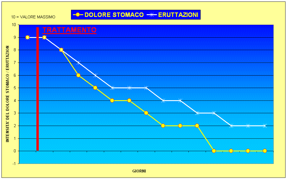 Il grafico, eseguito per il “dolore allo stomaco” e le eruttazioni, ma valido anche per gli altri sintomi, mostra come la situazione si regolarizzi nel giro di 10 giorni.
