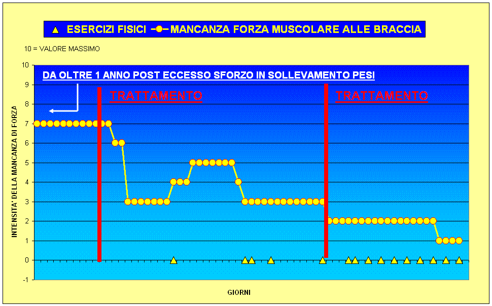 Dopo il 2° trattamento si ha un ulteriore istantaneo miglioramento ed il grafico dimostra come subito il paziente ne approfitti per tornare ad allenarsi intensamente (a mio parere un poco più di pazienza non avrebbe fatto male) mentre il dolore diminuisce ulteriormente.